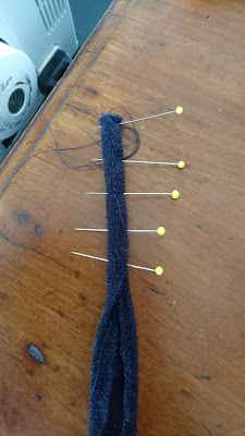 Om te zorgen dat de naad in het midden van de achterkant van dat bandje komt, heb je toch wel een aantal spelden nodig, want het bandje is behoorlijk eigenwijs. uiteindelijk gaat er ook een rijgdraadje doorheen, want met spelden kan ik het niet verwerken in het halssplitje.